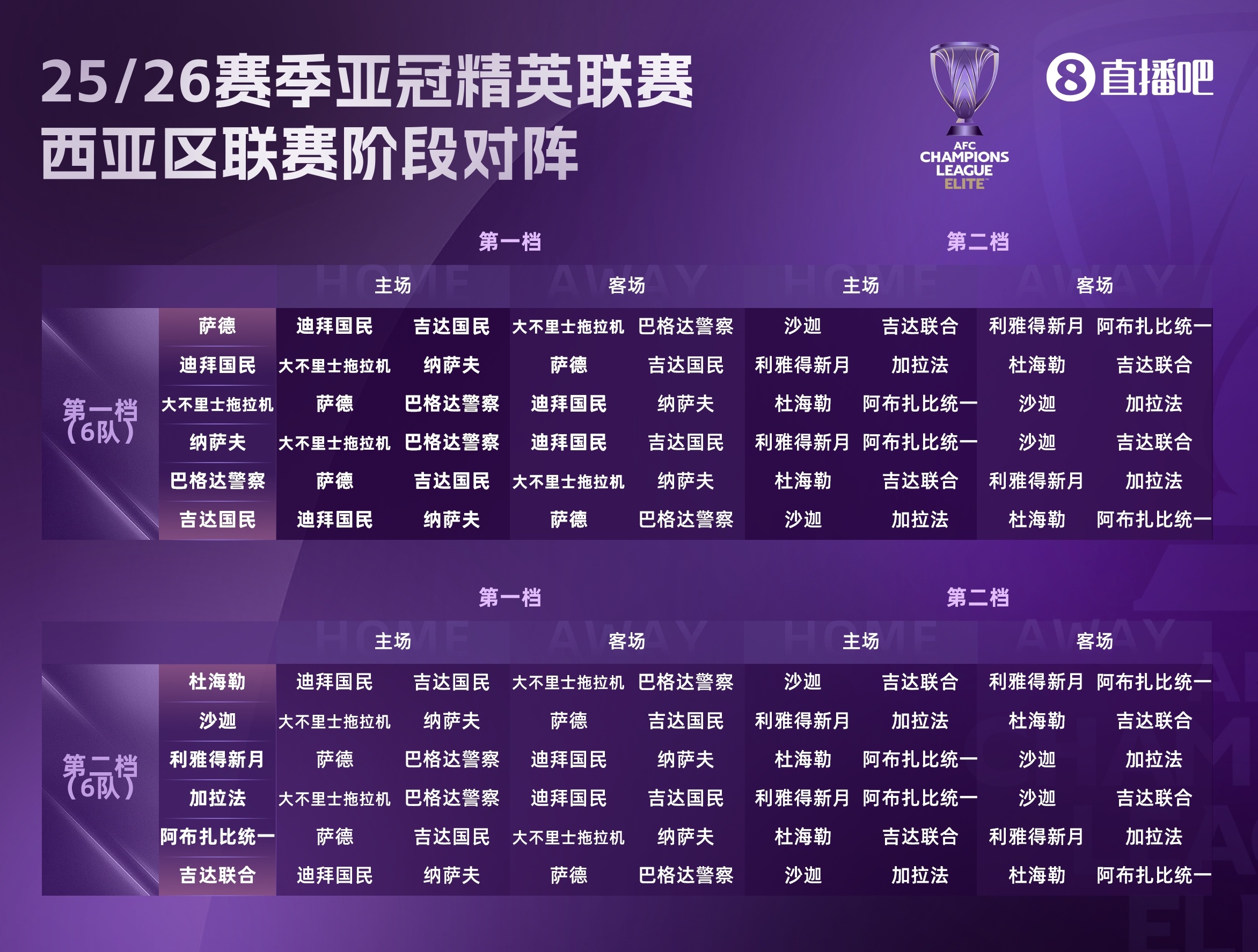 新赛季的亚冠精英联赛瑞士轮阶段比赛将分别在9月15日-17日、9月29日-10月1日、10月20-22日、11月3-5日、11月24-26日、12月9-10日(西亚区12月22-23日)、2026年2月9-11日、2月16-18日共八个比赛日举行。