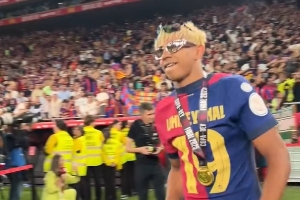 开云官方网-巴萨列队拍头庆祝夺冠亚马尔头发吸睛,孔德闷头向前冲